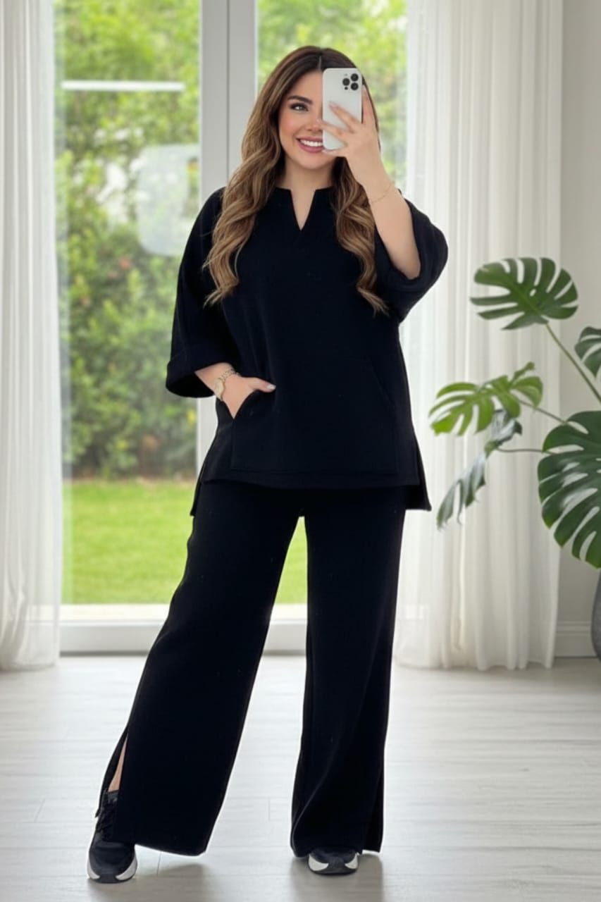 Made with premium double fleece fabric, this set includes a relaxed-fit top and flared trousers with a trendy bottom cut style.